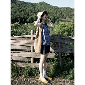 YT424854 純粋な夏の美しい年齢軽減衣装女性のための青いチェック柄サスペンダースーツスカートの完全なセット 2025