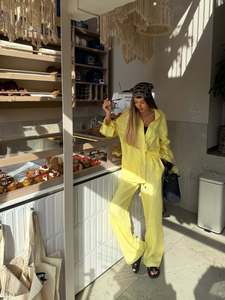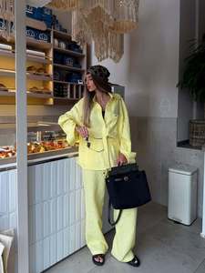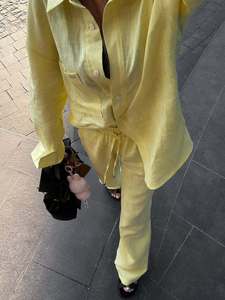 2025年秋冬新作ヨーロッパとアメリカの女性用カジュアル無地綿麻長袖ズボンシャツ2点セット初秋女性用