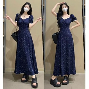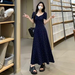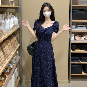 プラスサイズのフレンチレーススクエアネックネイビーブルー花柄ロングスカート女性のための夏のファットmm気質レトロ甘い痩身ロングスカート