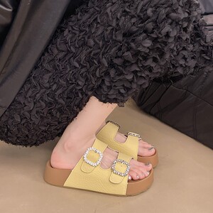 女性が外で履くための厚底ベルトバックルサンダル 2025 夏の新しいレトロなラインストーンスクエアトゥスリッパ ¥