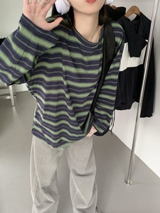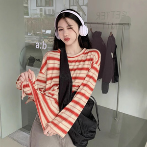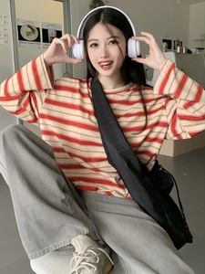 ラウンドネックストライプ長袖 Tシャツ女性のための 2025 秋の新デザインルーズ痩身カジュアル学生スリットトップ