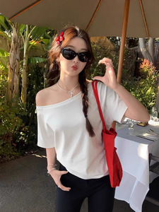 Su San San 傾斜ショルダートップ女性の夏 2025 新しいスタイルオフショルダーグレー半袖 Tシャツルーズワンショルダー