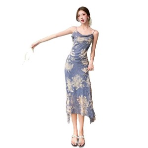 フランスのサスペンダー、美しいスリムフィットの花柄ドレス、女性の夏のニッチなスタイル、ユニークで美しい休暇のロングドレス