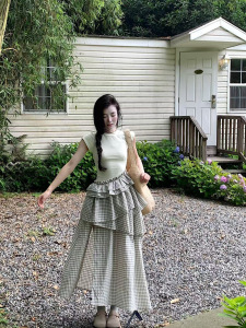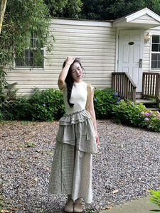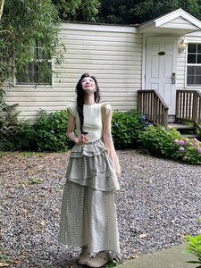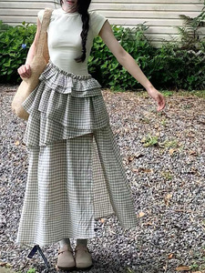 韓国の不規則なチェック柄スプライシング半袖ドレス女性のための 2025 夏の新しいウエスト痩身デザインロングスカート