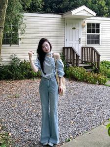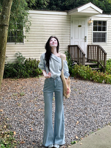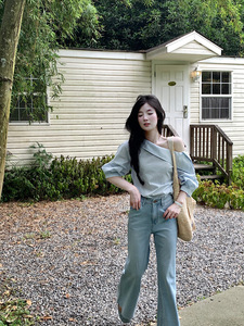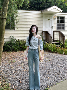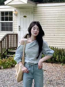 フレンチスタイルの斜め肩五分袖シャツ2025夏の新しいデザインブルーニッチルーズトップ女性用