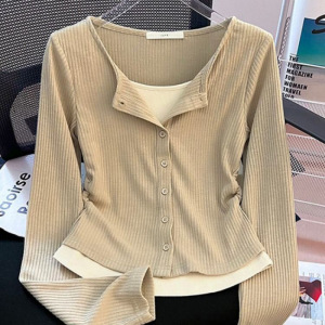 撞色拼接假两件单排纽扣长袖恤女2025春秋褶皱收腰显瘦打底上衣