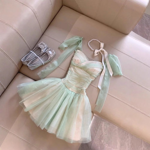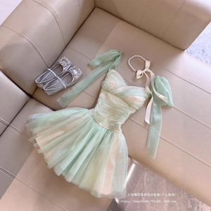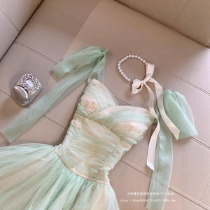 温柔绝美网纱拼接蝴蝶结吊带连衣裙女甜美小个子收腰显瘦短裙ins