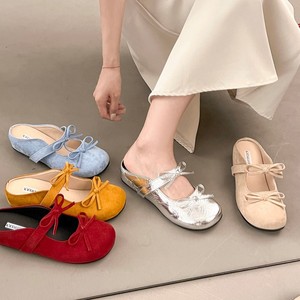 女性の夏のアウターウェアのための内側の高さを高めるレトロなリボン包頭ハーフスリッパ 2025 新しい怠惰なワンステップサンダル