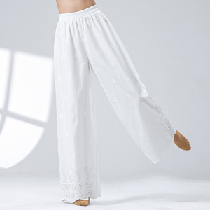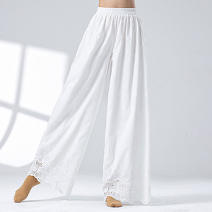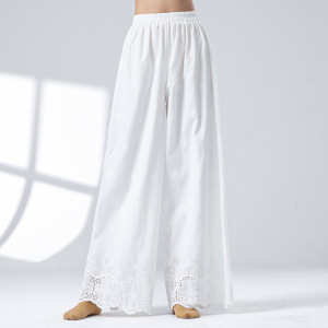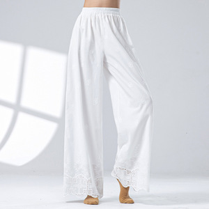 女性用純綿インナーパンツ、透かし彫り立体レリーフ刺繍入りゆったりチャイナパンツ、デイリーホワイト練習用禅パンツ