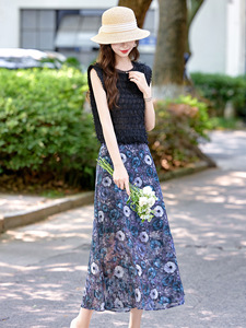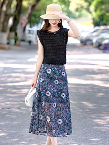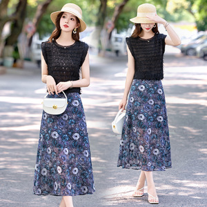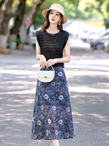 ファッションカジュアルスーツ 2025 夏の新女性のノースリーブトッププリントハーフスカートツーピーススカート RX9255