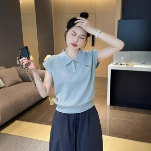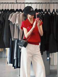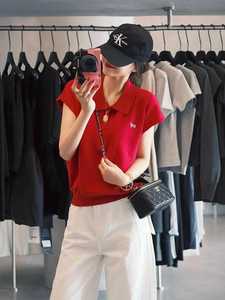 レッドポロカラースモールフライングスリーブニットアイスシルクショートトップ女性の夏美白ドーパミン右肩半袖Tシャツ