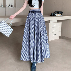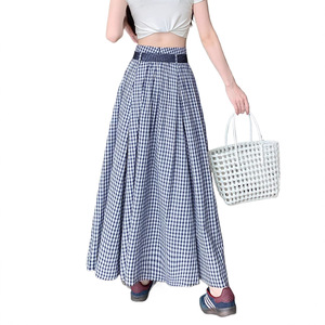 レトロチェック柄スカートレディース夏ハイウエストスリムカジュアル万能ドレープAラインプリーツ大振り傘スカート