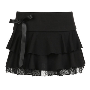 インダークスタイルのリボン要素レースステッチスリムスカート女性のホットガールハイウエスト多層プリーツスカート