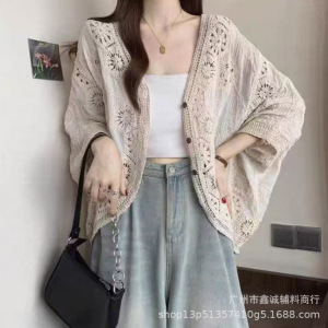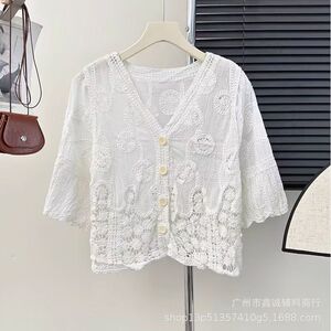 Vネック中空かぎ針編み七分袖カーディガンレディース夏大きいサイズレイジースタイルフレンチスタイルショールアウター