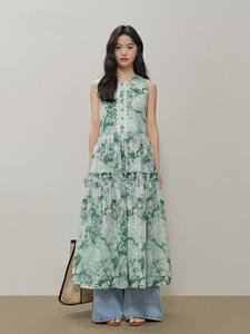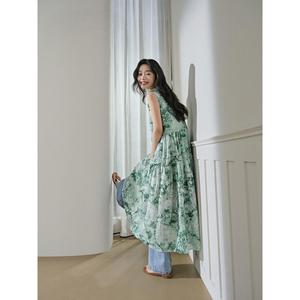 ワイドフレンチノースリーブベストドレス花柄ドレス2025夏着用新しい女性のグリーンウエストロングスカート