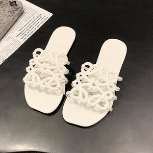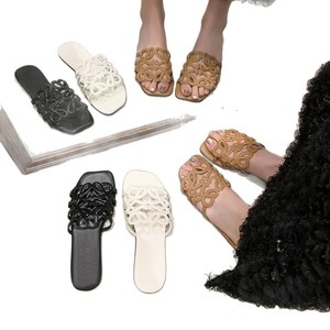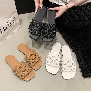 2025新款时尚一字型小众简约镂空凉拖鞋外穿平底方头休闲沙滩鞋女