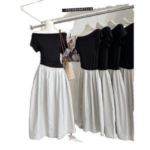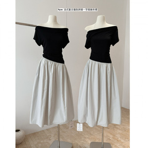 セナの夏の新作!コントラストカラーステッチワンショルダードレスレディースデザインウエスト痩身ヘップバーンスタイルロングスカート