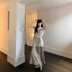 リアルショットイミテーションリネンドライクールオールドマネースタイル中空日焼け止めブラウス+ドレスファッションスーツ女性用84655