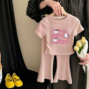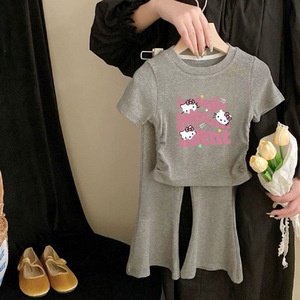 女童夏季套装新款休闲宝宝印花外穿喇叭裤短袖卡通洋气潮流两件套
