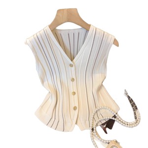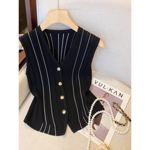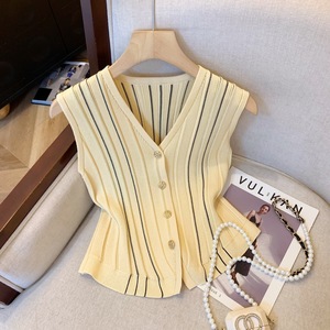 フレンチコントラストストライプVネックニットベストレディース夏新作高級ベストノースリーブトップA4531