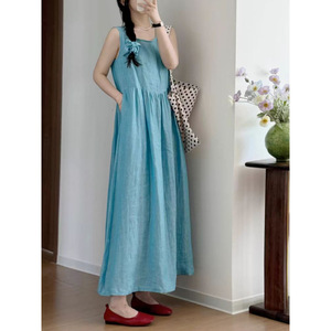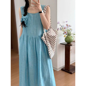 ドーパミンブルー! JU ホワイト織麻サンドウォッシュスクエアカラーノースリーブドレスレディースミドル丈ベストドレス