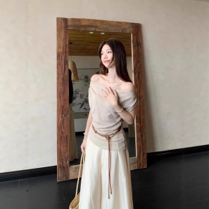 適美2025秋リゾート風セットアップ ゆったり斜め肩半袖Tシャツ レディース ドレープ感 着痩せ効果 ワイドパンツ ツーピース