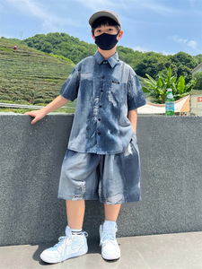 男の子の夏模造デニムアイスシルクスーツ薄い 2025 新しい夏クールスタイルシャツ半袖ショーツトレンディ