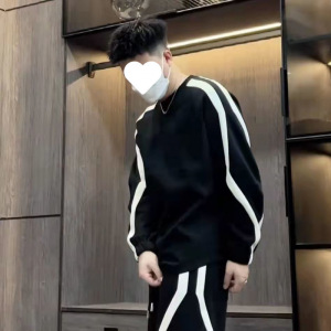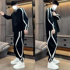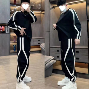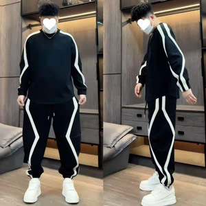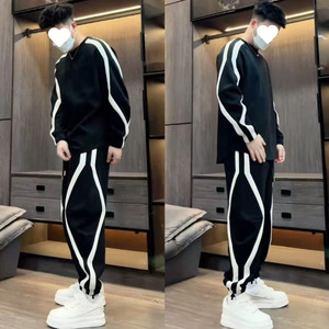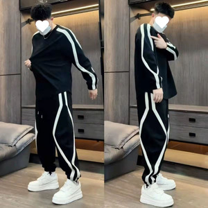 春と秋の新ストライプスプライシングラウンドネックスウェットシャツとスウェットパンツツーピースメンズトレンディなルーズスポーツとレジャースーツ