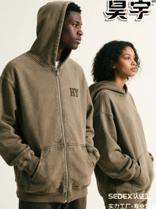 HYメンズカスタムアメリカンスタイルジップアップスウェットシャツ春秋フード付きジャケットウォッシュ加工オーバーサイズ