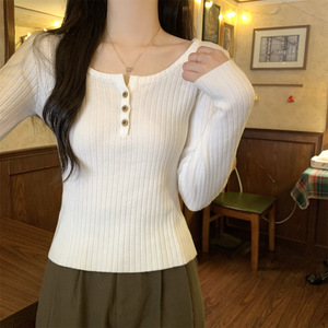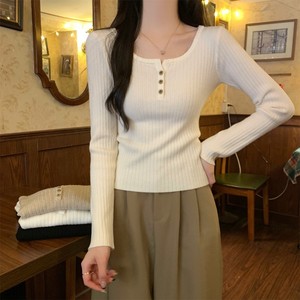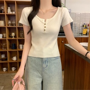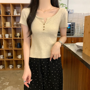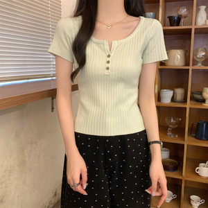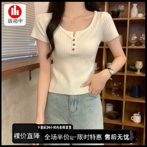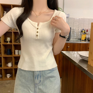 2025 早春スリムスクエアカラーボタンニット半袖レディース夏の新しいスタイルのインナーデザインショートボトムストップ