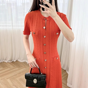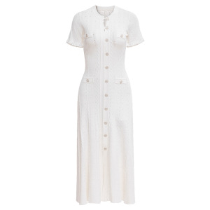 法式时尚名媛小香风春夏纽扣提花麻花修身圆领短袖针织镂空连衣裙