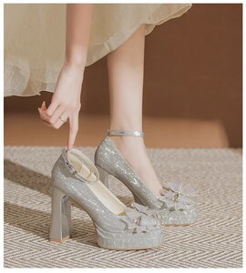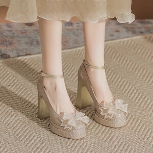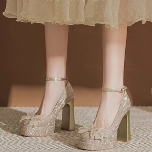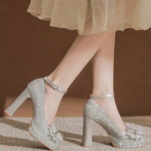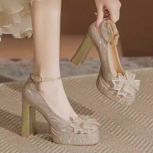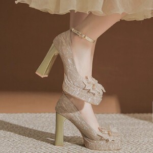 2025 新しいウェディングシューズブライダルシューズスクエアトゥワンラインバックルメリージェーンレディースシューズリボン防水プラットフォームハイヒール