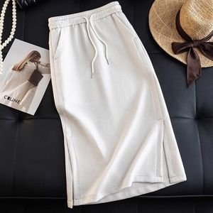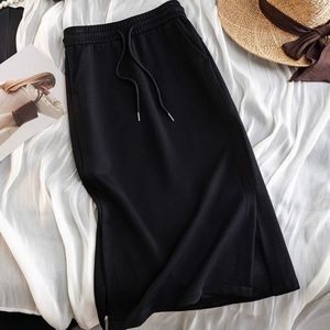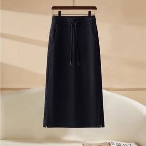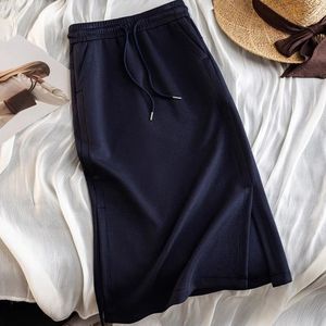 藏蓝色中长款开叉半身裙女2025春夏爆款裙紧腰抽绳a字一步包臀裙