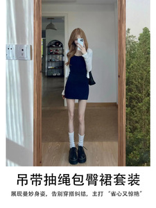 ネイビーブルーの継母ヒップカバースカート、純粋な欲望のタイトなサスペンダードレスとカーディガンのツーピースショートスカート、女性用夏