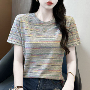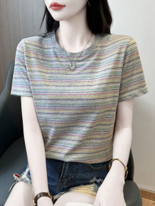棉质条纹短袖t恤女2025新款夏季正肩宽松显瘦圆领高端半袖体恤衫