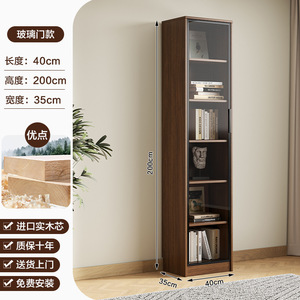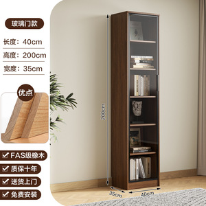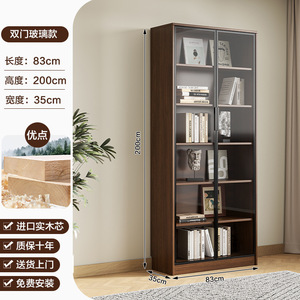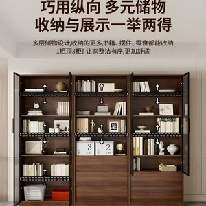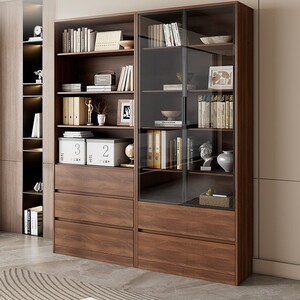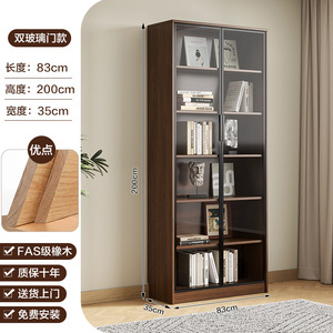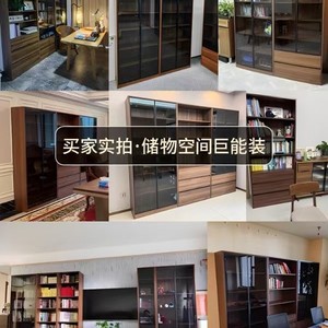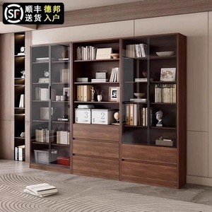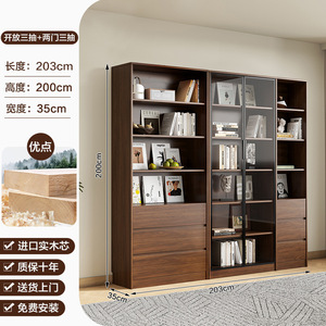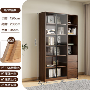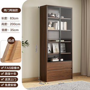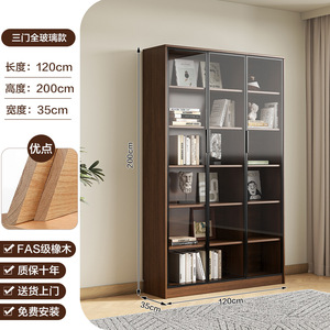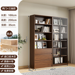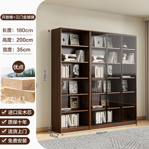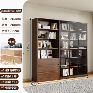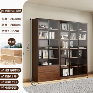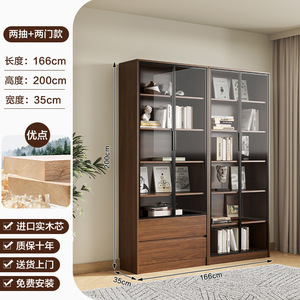 無垢材の本棚と収納キャビネットが一体化したホームリビングルームの壁面ディスプレイキャビネット収納ラック、ガラスドア付き、壁全体の床から天井までのキャビネット