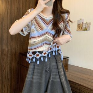 ドーパミンカラーストライプアイスシルク半袖Tシャツレディース夏新作韓国風エスニックスタイルタッセル中空ショートトップ
