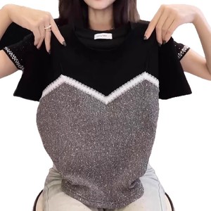 ラウンドネックデザインパッチワーク半袖Tシャツレディース夏人気大きいサイズファットMMファッション通勤万能カジュアルトップス