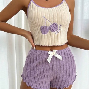 対外貿易クロスボーダーホットスタイルアマゾンヨーロッパとアメリカンスタイルの刺繍入りパジャマ女性用起毛キャミソールショーツスーツホーム