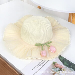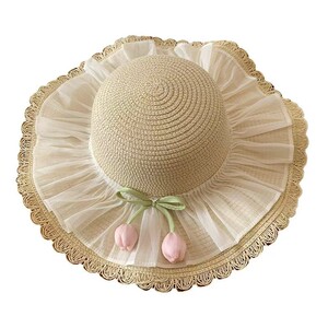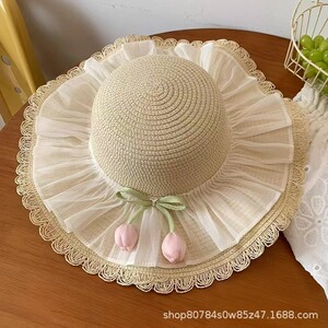 ファッショナブルなチューリップ夏の女性の麦わら帽子大きなつば折りたたみ花新鮮で甘いレースプリンセススタイル多用途カバー