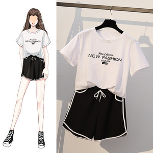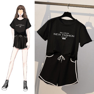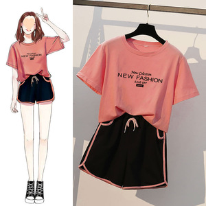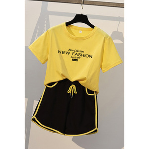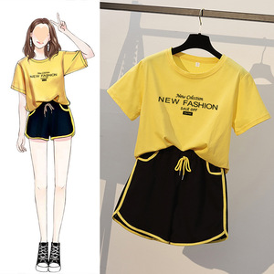 棉休闲运动套装女夏两件套黄色宽松恤短袖短裤睡衣跑步服健身