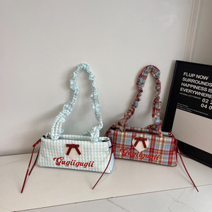 ニッチチェック柄リボン脇の下バッグ女性のための 2025 夏超ホットファッションプリーツハイエンドシングルショルダーバゲットバッグ