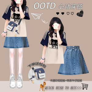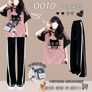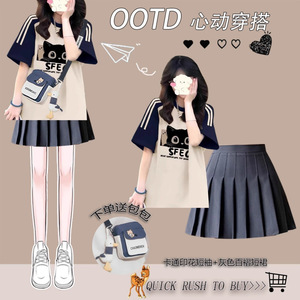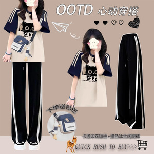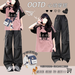 2025夏季套装女学生美式女学院风爆款短袖T恤+休闲工装裤两件套