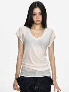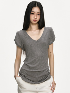 2025年新作ウエストデザイン無地Vネック右肩スリムフィットスリムフライングスリーブTシャツ