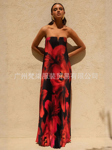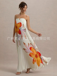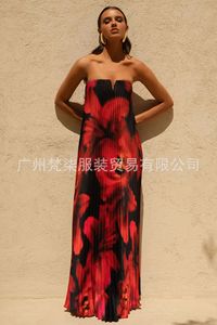 2025 ヨーロッパとアメリカのクロスボーダー Amazon ファッション気質プリントプリーツドレスノースリーブチューブトップフレンチホリデーロングドレス