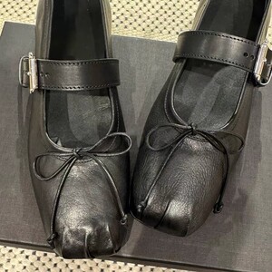 シープスキンバージョン〜女性用のハイエンドプリーツスクエアトゥワンラインバックルシューズ、レトロな浅い口のリボン付き小さな革靴