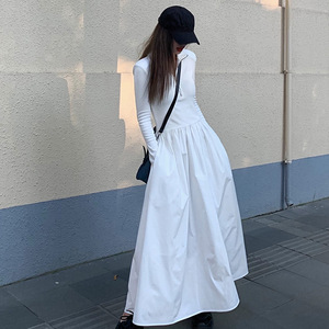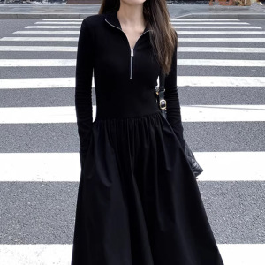 ヘボン風黒長袖ニットドレス2025新作レディース初春ウエスト痩身ロングスカート
