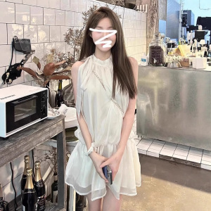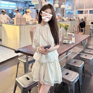 法式杏色无袖挂脖吊带连衣裙女夏季新款度假风小个子收腰a字短裙