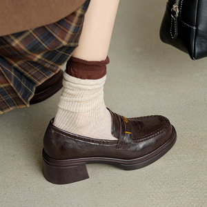 第一層シープスキン〜5cmハイヒールレトロ厚底ローファー女性用2025秋ラウンドトゥ深口太ヒール小さな革靴