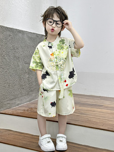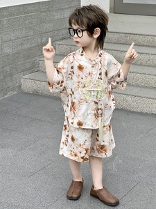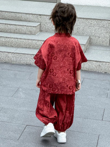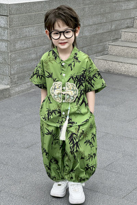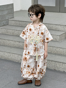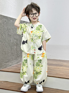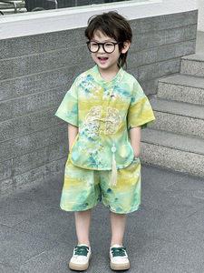 男の子と女の子 2025 夏スーツ夏の新中国風半袖子供ツーピース刺繍古代風スーツ